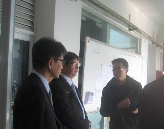在洽谈会之前,翁英惠院长和刘永元副处长参观了机械工程学院的实验室,并提出了很多宝贵意见,他们建议,专业发展要和产业有互动,和其他的专业交叉结合,复合成长,最后达到引导产业发展,获得研发效益。